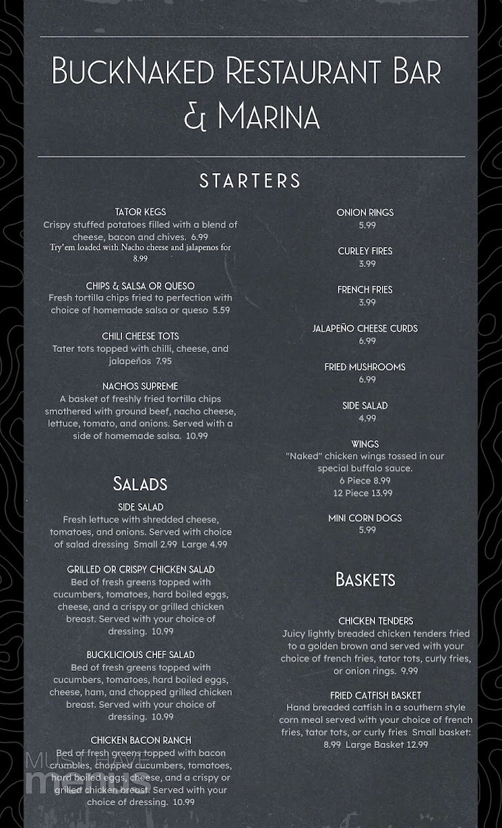 BuckNaked Restaurant, Bar & Marina Menu (2025 Update)